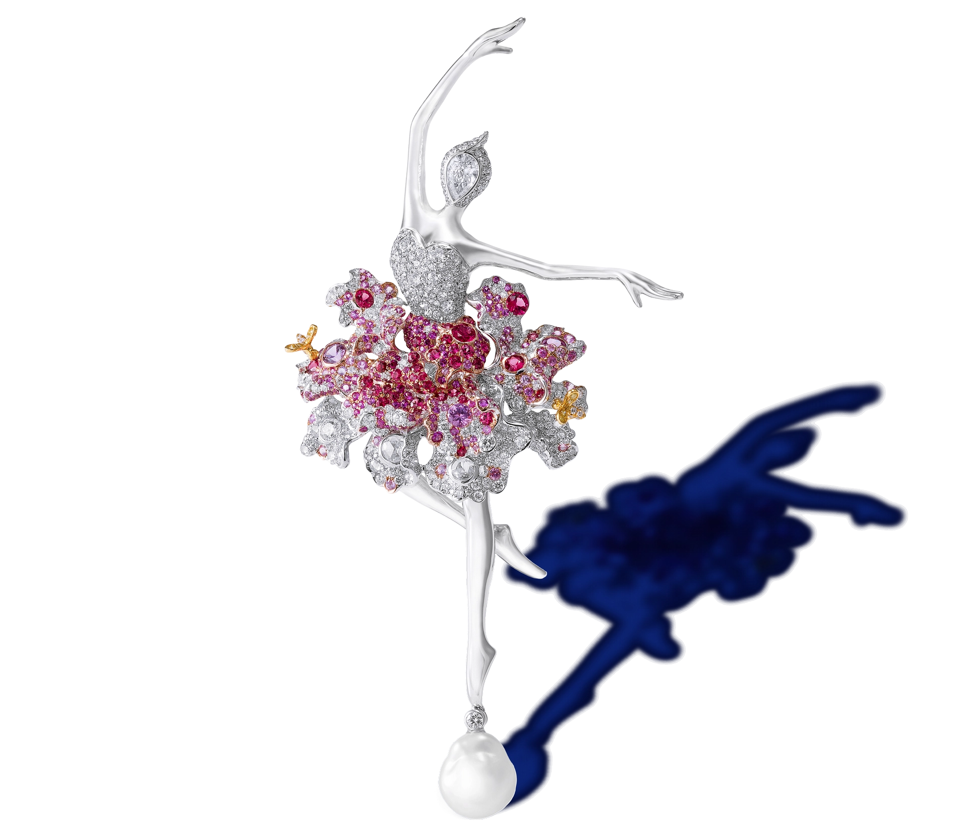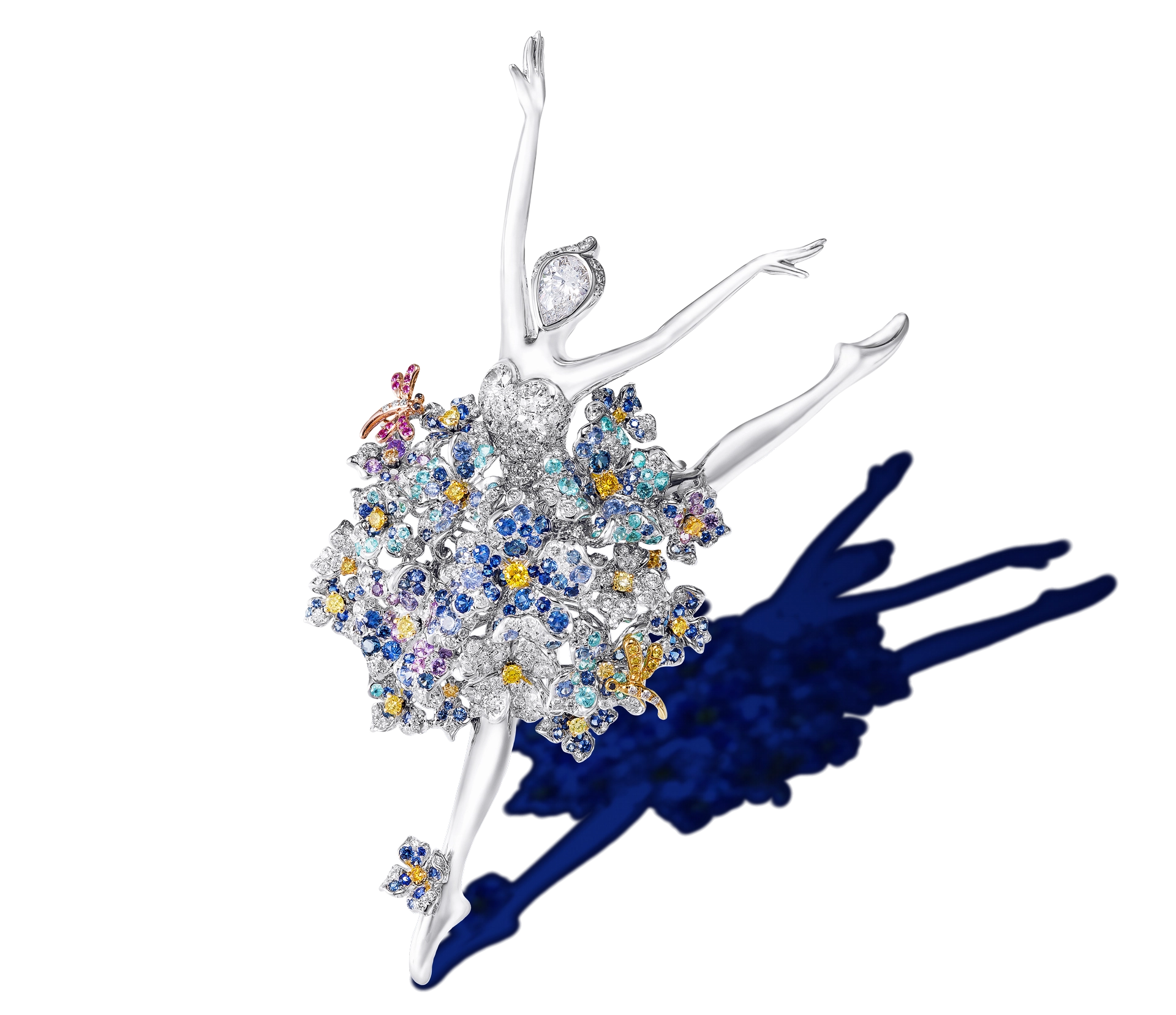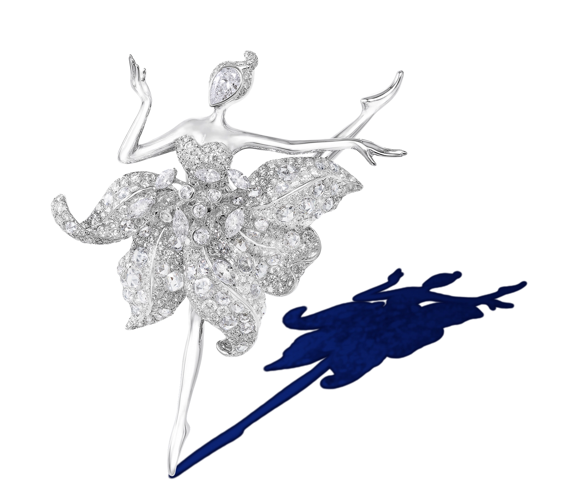 Bianca Lily Ballerina Fairy Brooch/Pendant ![]() A 0.50-carat E/VS1 pear-shaped brilliant-cut diamond, white diamonds; 18-karat white gold The purity of the all-white diamond palette of the Bianca Lily Fairy is in stark contrast to the other color-saturated ballerina fairies in the series. Hu paid particular attention to the arm placement, expressively bending one arm and turning the hand inward, as the ballerina poses in an introspective arabesque. | ![]() |
