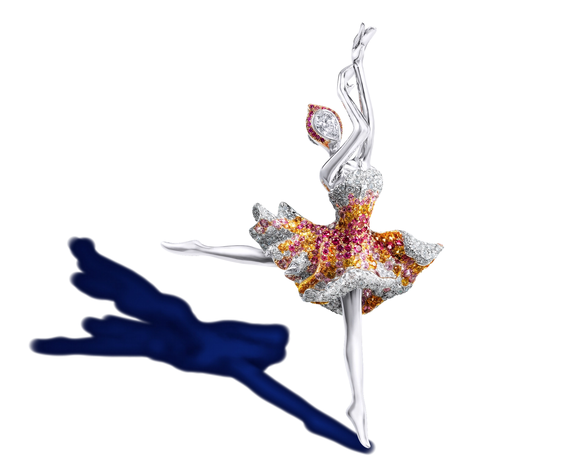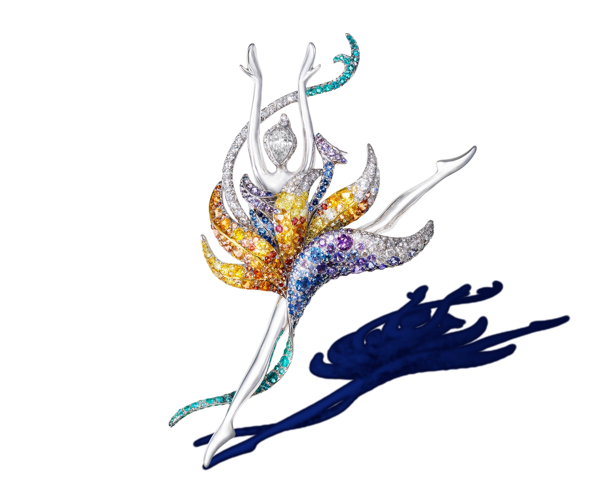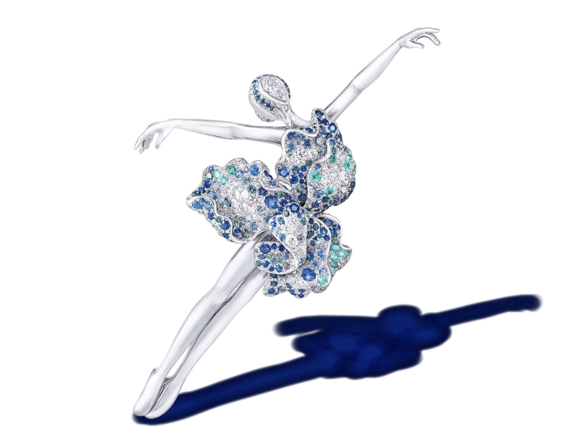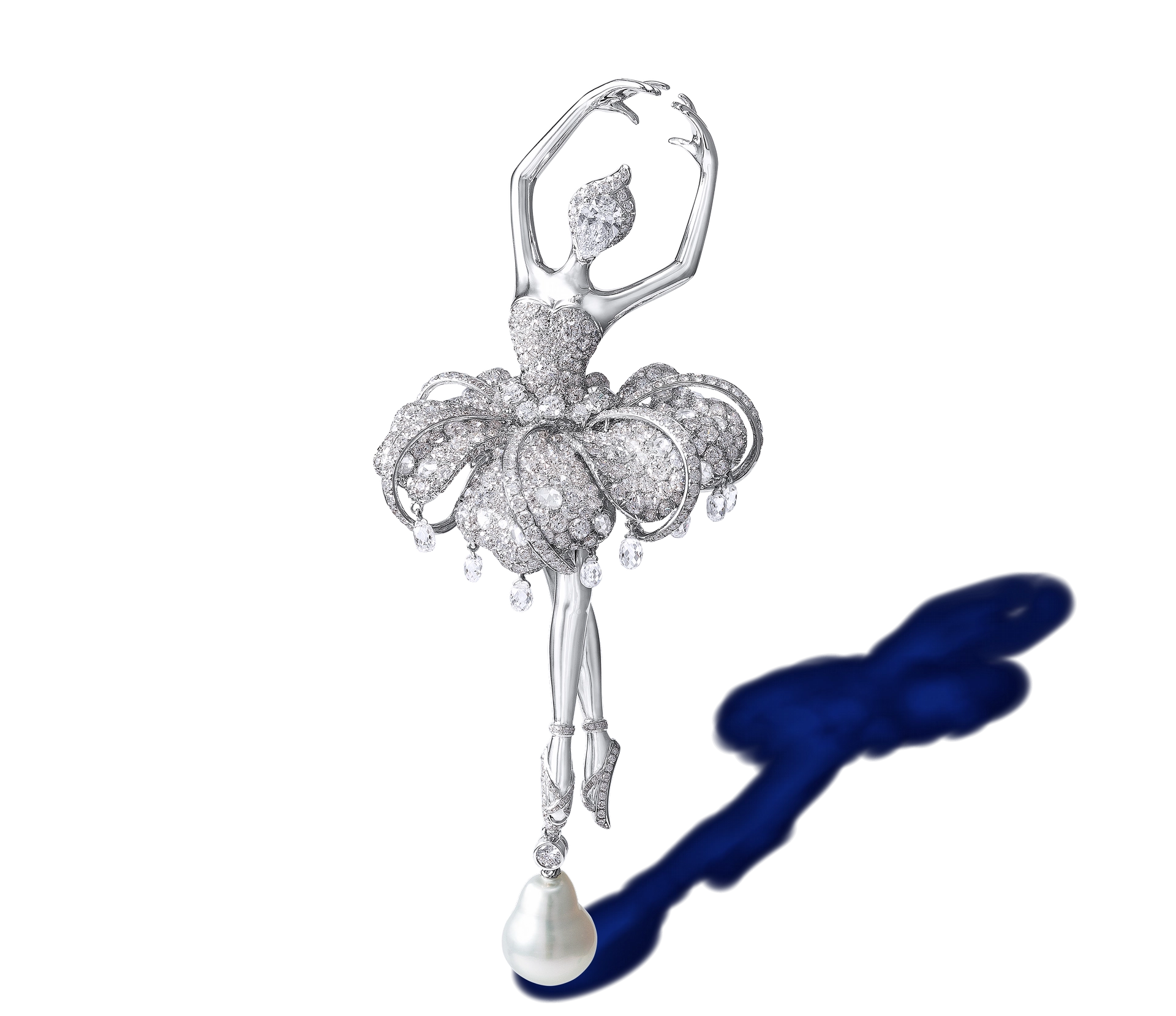 Bianca Lily Ballerina Fairy Brooch/Pendant ![]() A 0.50-carat E/VS1 pear-shaped brilliant-cut diamond, white diamonds; 18-karat white gold The purity of the all-white diamond palette of the Bianca Lily Fairy is in stark contrast to the other color-saturated ballerina fairies in the series. Hu paid particular attention to the arm placement, expressively bending one arm and turning the hand inward, as the ballerina poses in an introspective arabesque. | ![]() |