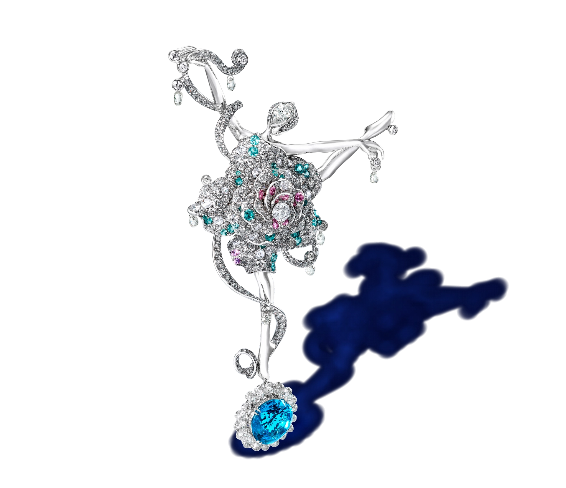 ![]() | Asura Rose Ballerina Fairy Brooch/Pendant ![]() A 10.95-carat Paraiba tourmaline, a 0.50-carat E/VS1 round brilliant-cut diamond, diamonds, Paraiba tourmalines, pink sapphires; 18-karat white gold This ballerina fairy is clothed in a white rose tinged with pink and blue. A diamond ribbon threads around her limbs as she executes an expansive arabesque. Asura, a Hindu deity, dances atop a wheel of fire fashioned out of a dazzling Paraiba tourmaline. Traditionally associated with male protagonists, here the wheel of fire is transformed into a powerful expression of femininity. |