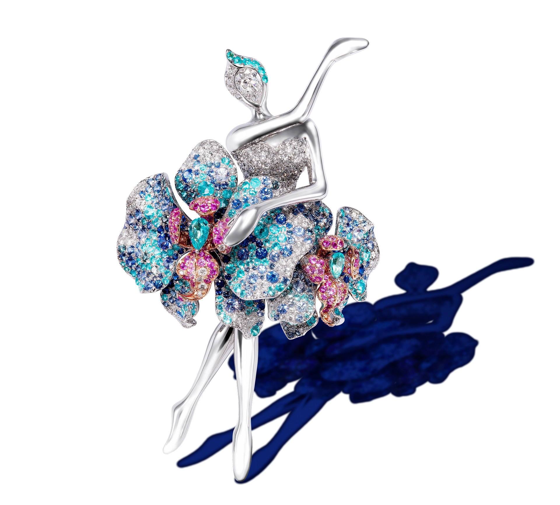The ballerina fairies are a nod to the influence of the Ballets Russes on jewelry. The exotic themes and colors of the fantastic costumes and productions performed in Paris and throughout Europe and the Americas from 1909 to 1929 began to be reflected in couture jewelry and changed the course of design. Instead of traditional tutus, Hu attires her fairies in undulating flower petals so technically precise in their execution that the stones and mounting create the impression of a swirl of fabric around an expressive dancer.