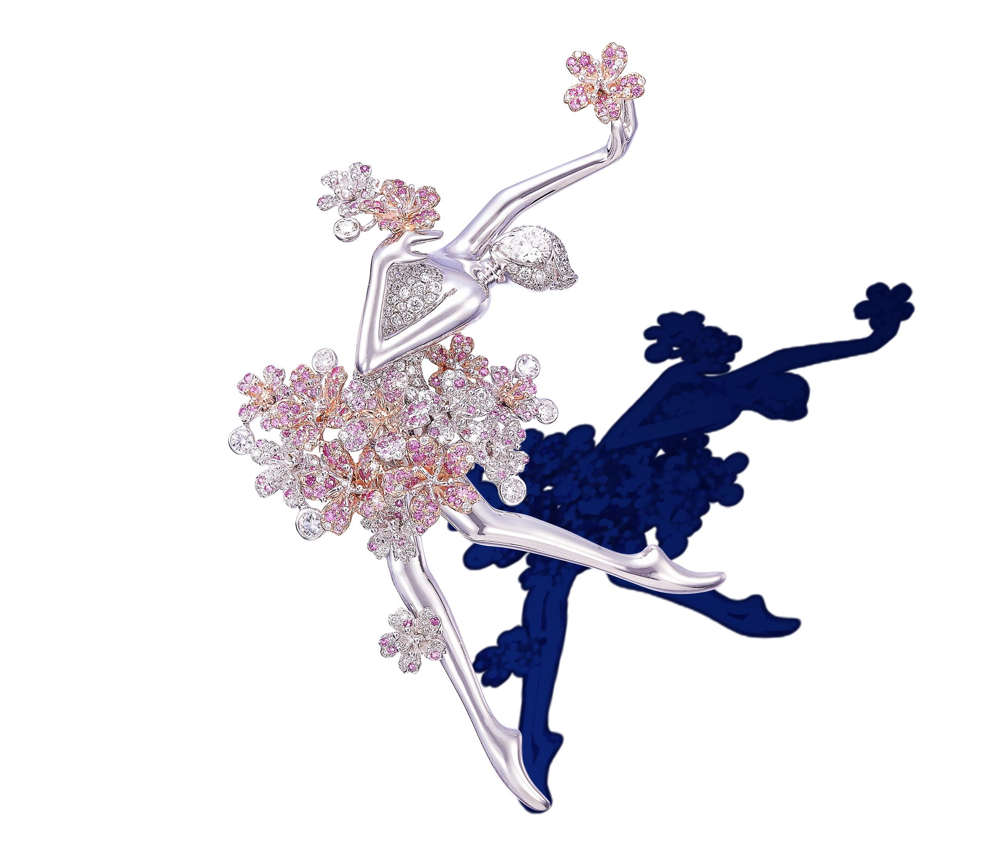 Cherry Blossom Ballerina Fairy Brooch/Pendant ![]() A 0.52-carat D/VVS2 pear-shaped brilliant-cut diamond, white diamonds, pink and white sapphires; 18-karat white and rose gold This ethereal fairy, clothed in a tutu of cherry blossoms, is posed in an elegant effacé. The cherry blossom (sakura) theme is important in Japanese art, representing the ephemeral beauty of life. | ![]() |